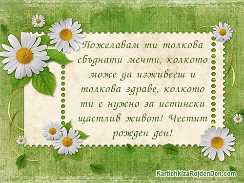 kartichkizarojdenden»Рожден ден»Пожелавам ти толкова сбъднати мечти, колкото може да изживееш и толкова здраве, колкото ти е нужно за истински щастлив живот! Честит рожден ден!